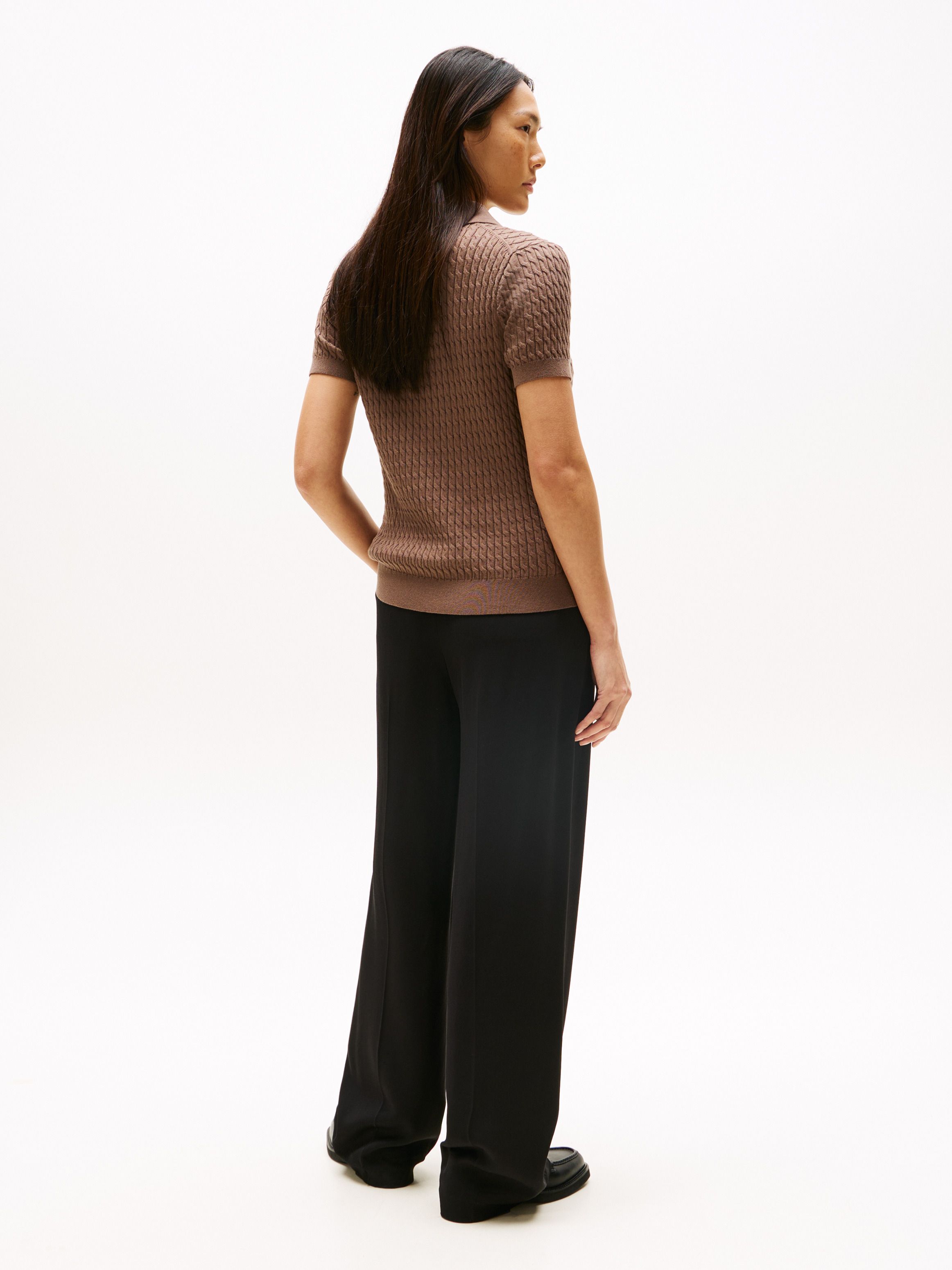 This short-sleeved jumper combines a sporty polo collar with fine-gauge cable-knit detailing for a lightweight take on seasonal layering.