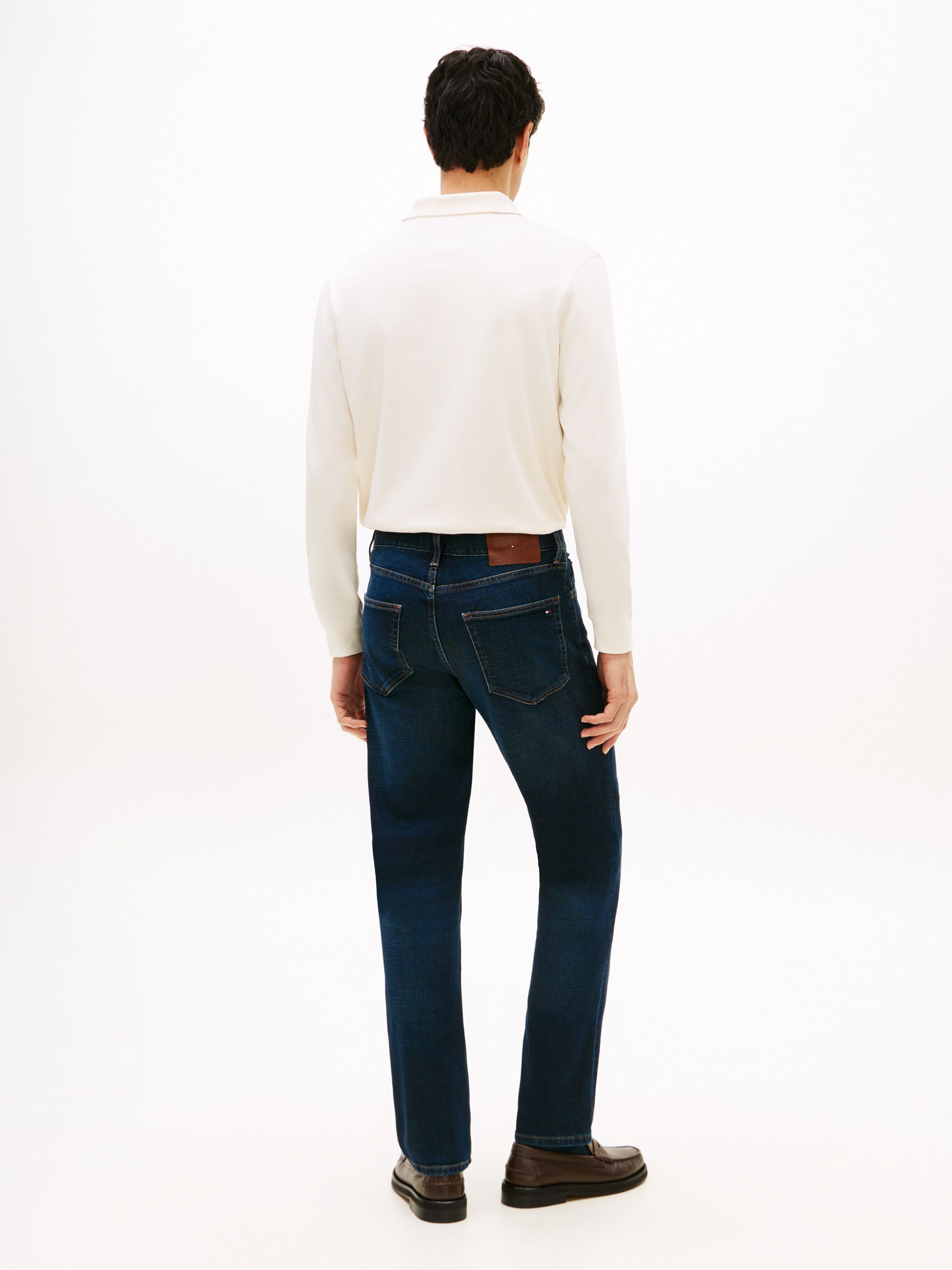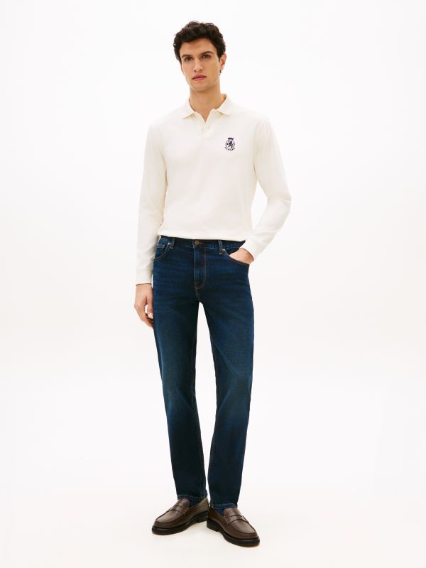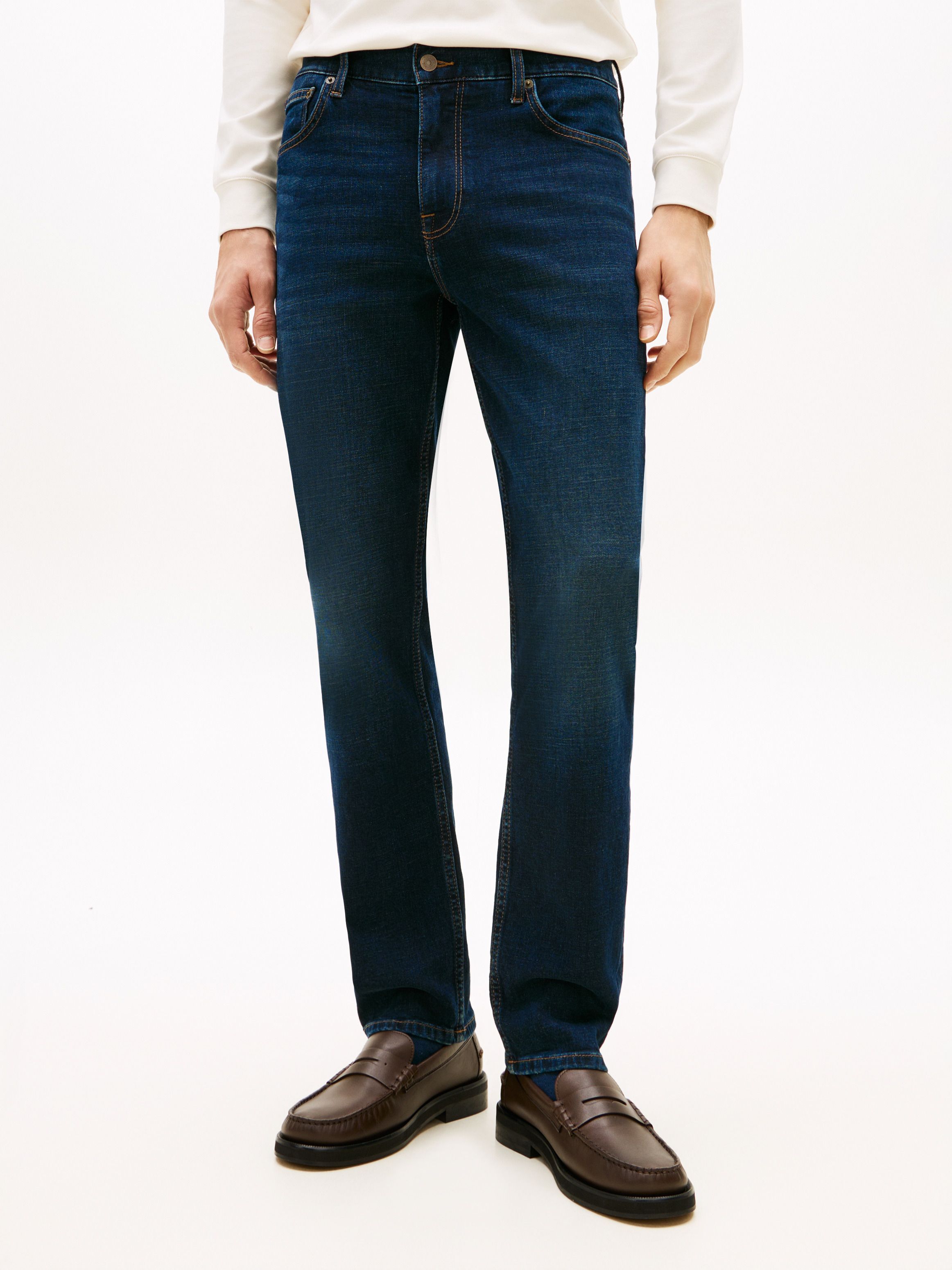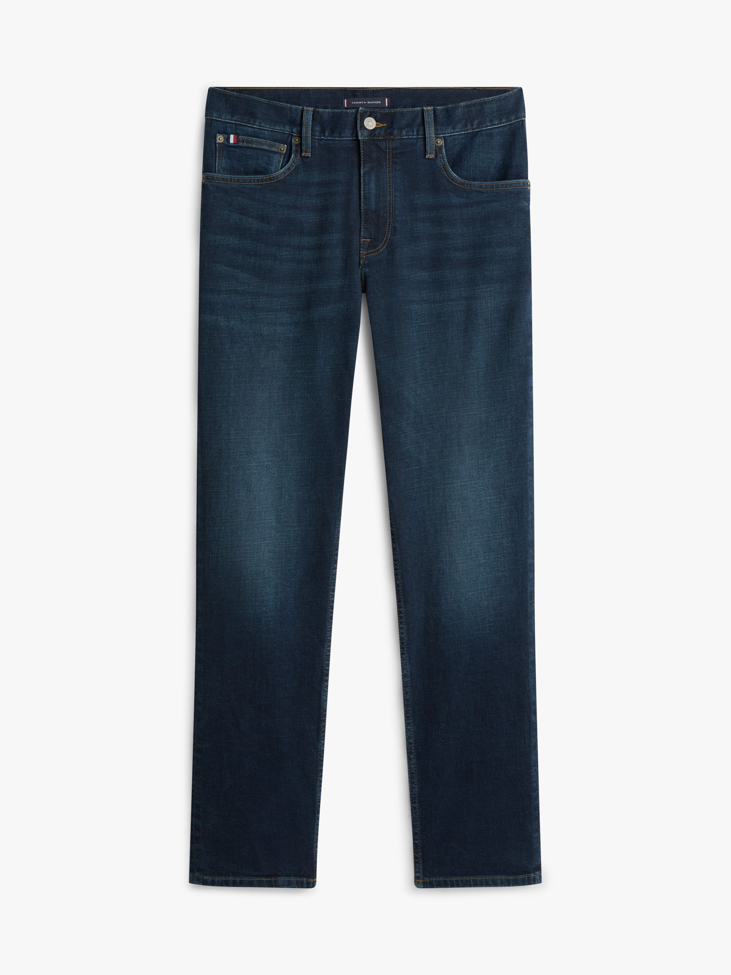 • Stretch cotton blend denim • Fading on knees and back • Zip with button closure • Five-pocket styling • Signature tape on coin pocket • Tommy Hilfiger branding • Tommy Hilfiger flag embroidery on back pocket