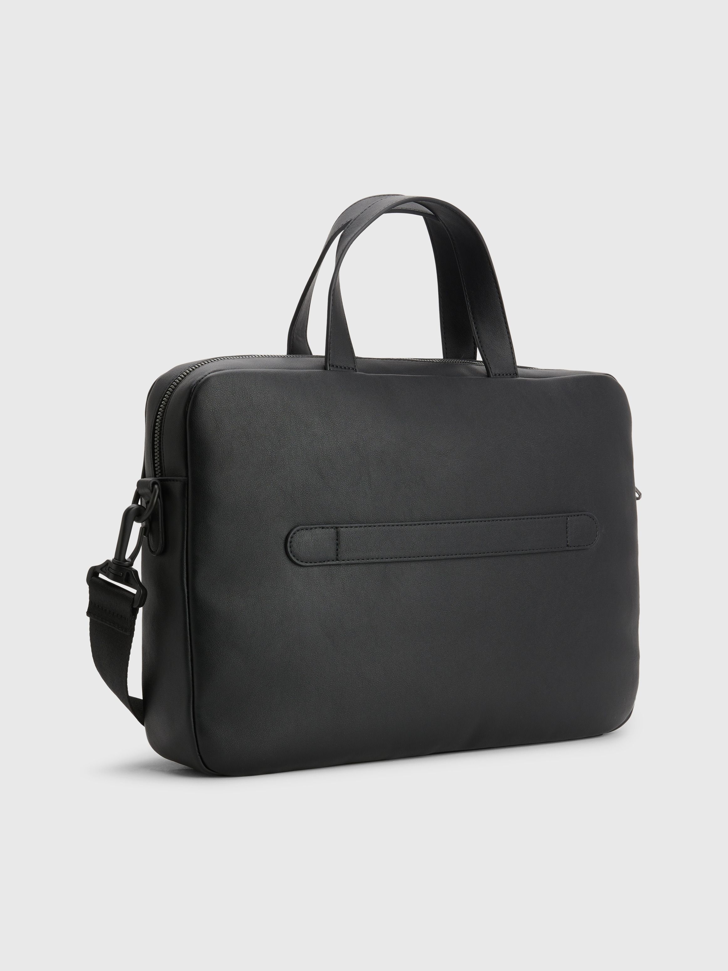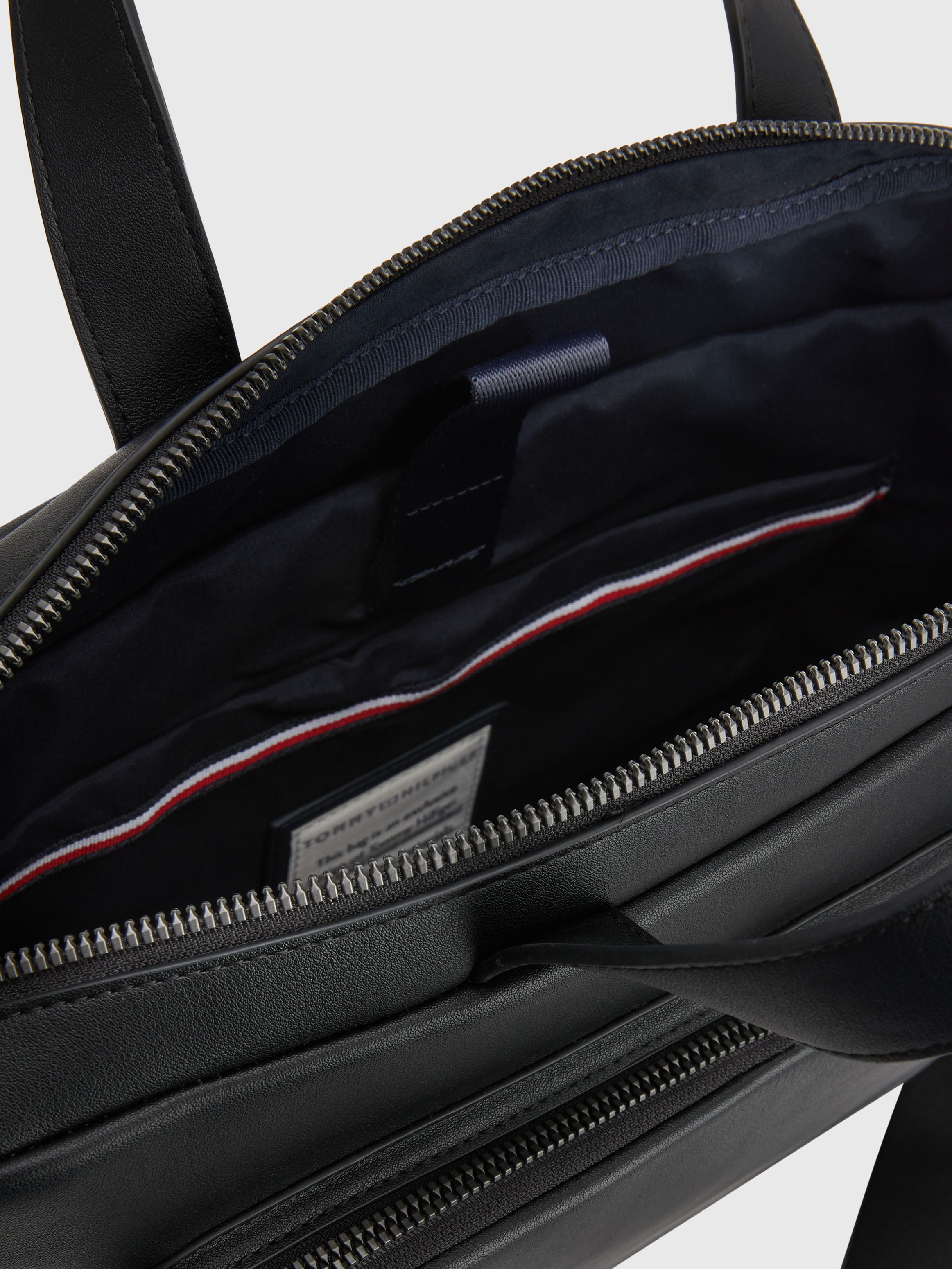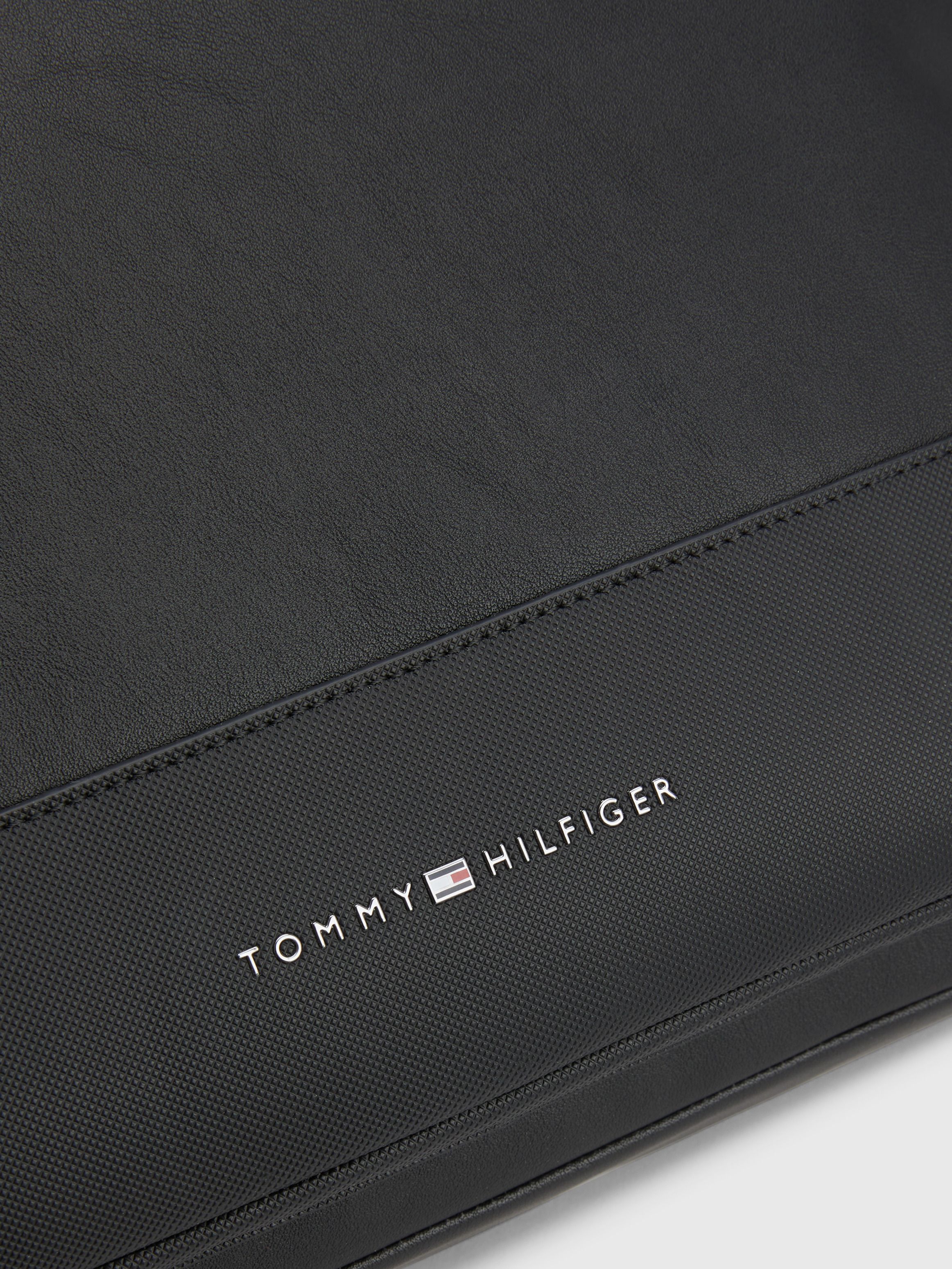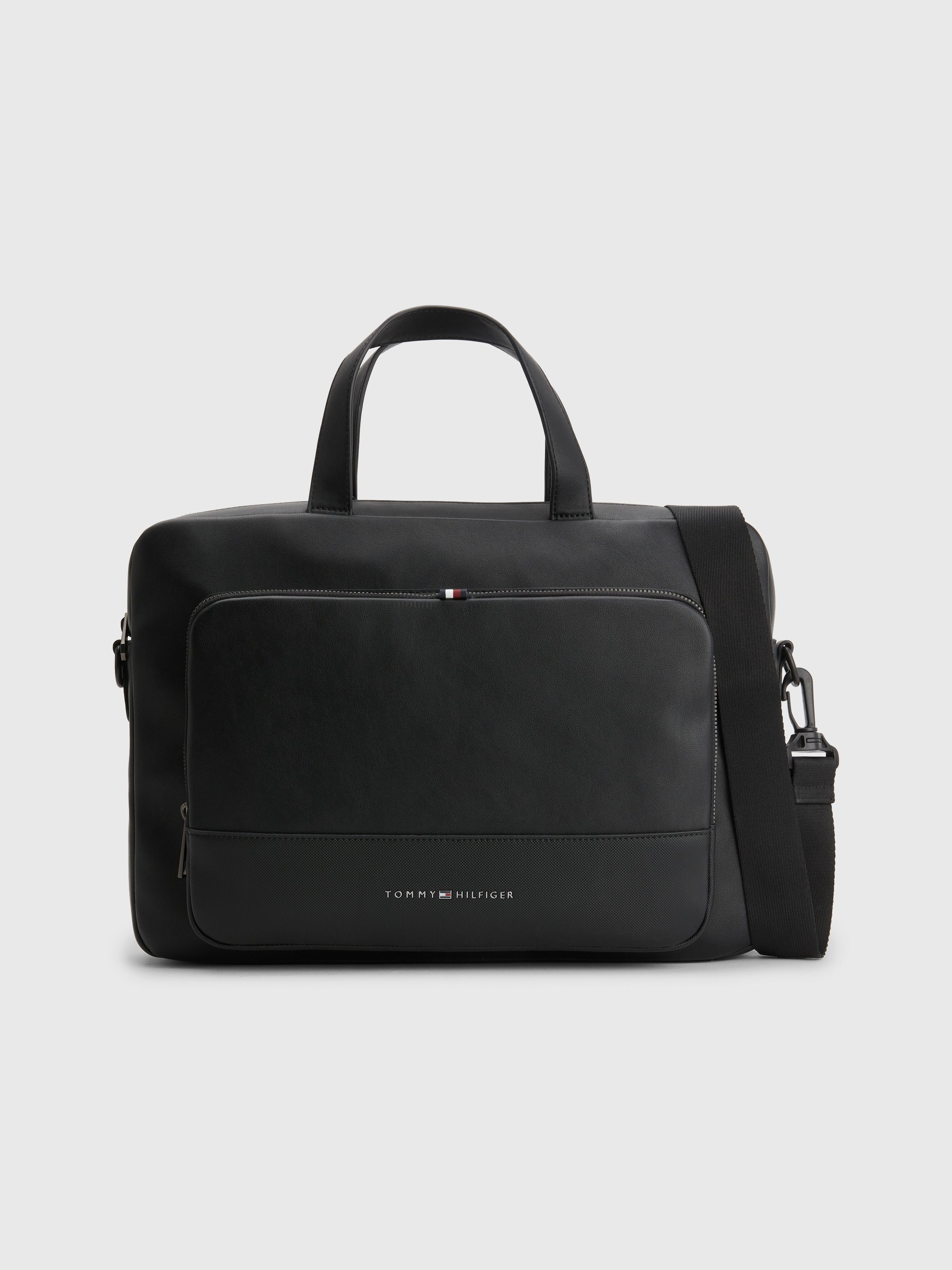 • Smooth finish • Zip closure • Two top handles • Adjustable, removable shoulder strap • One front zipped pocket • One interior slip pocket • Built-in laptop sleeve • Trolley strap • Tommy Hilfiger metal logo on front • Tommy Hilfiger branding