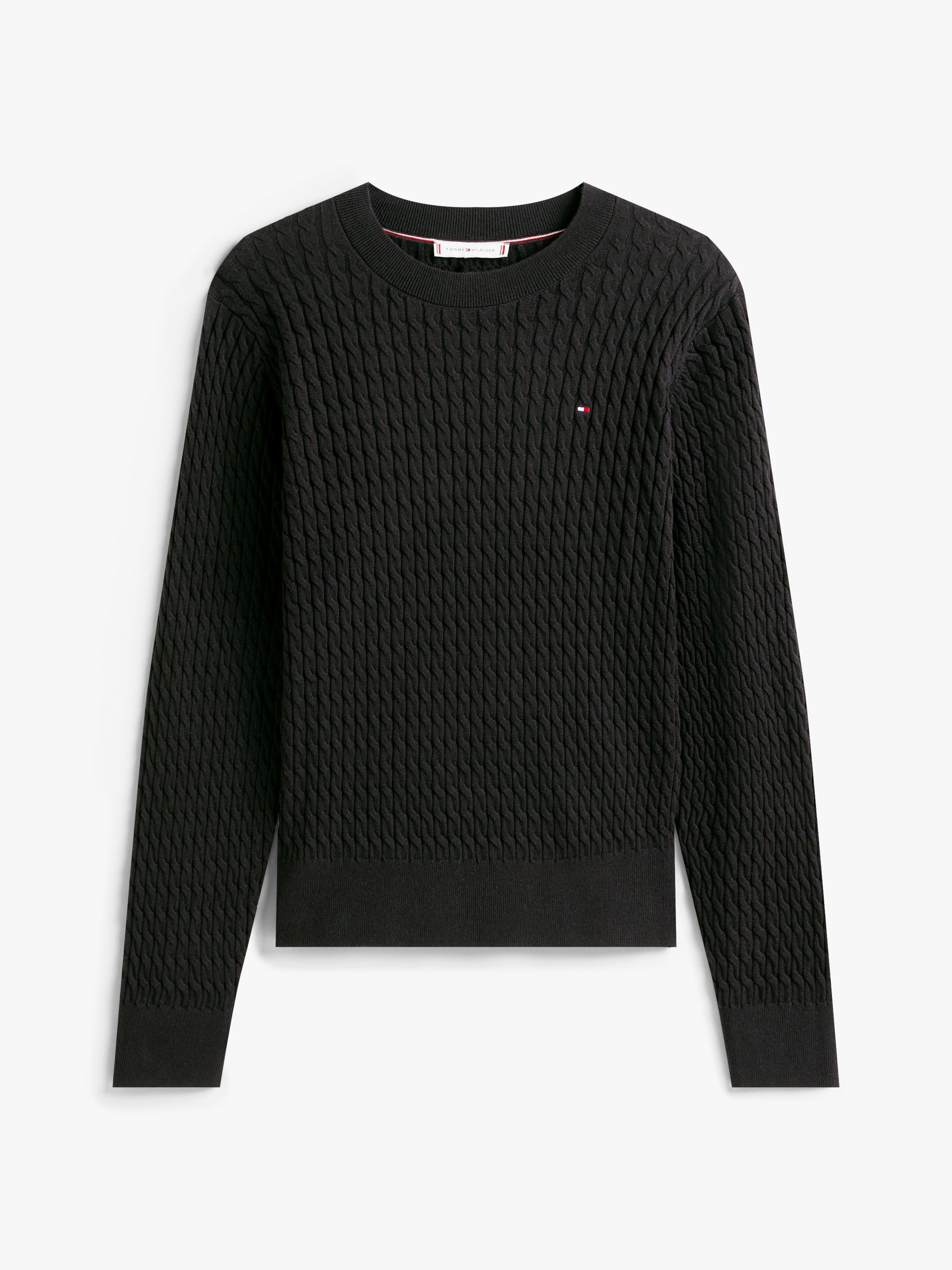• Pure combed cotton • Fine gauge • Cable knit • Contrast crew neck • Rib-knit collar, cuffs and hem • Tipped cuffs • Signature tape inside neckline • Tommy Hilfiger branding • Tommy Hilfiger flag embroidery on chest