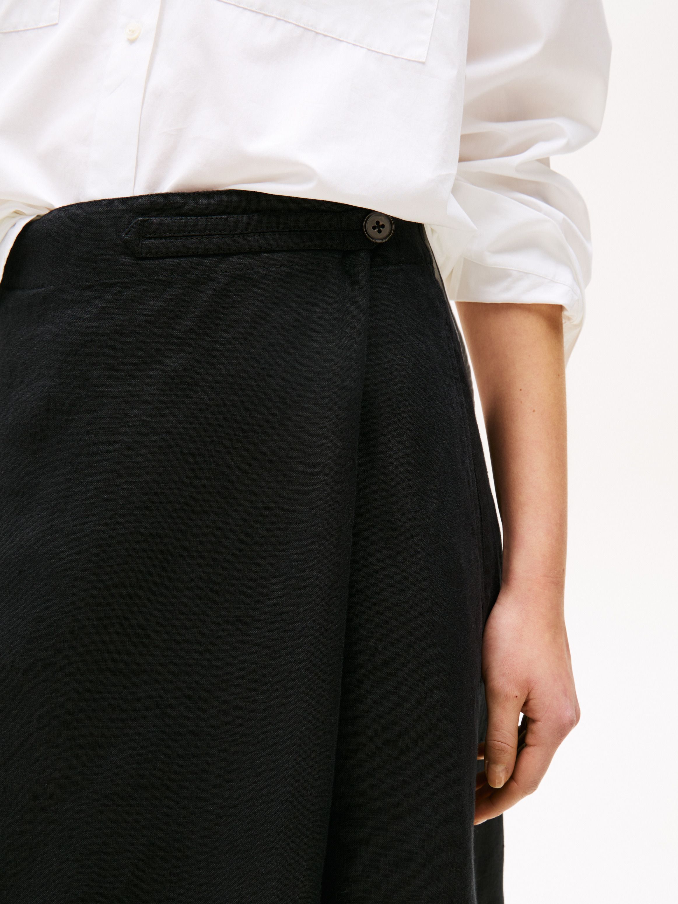 This linen-blend skirt with handy side pockets is designed with a flattering wrap front and a metal flag on the midi-length hem.