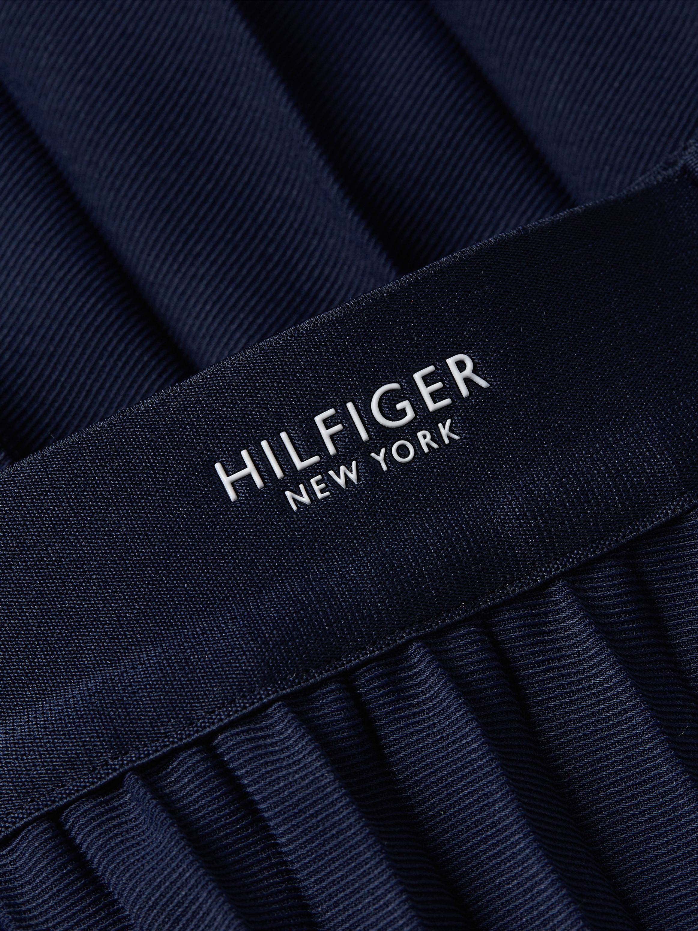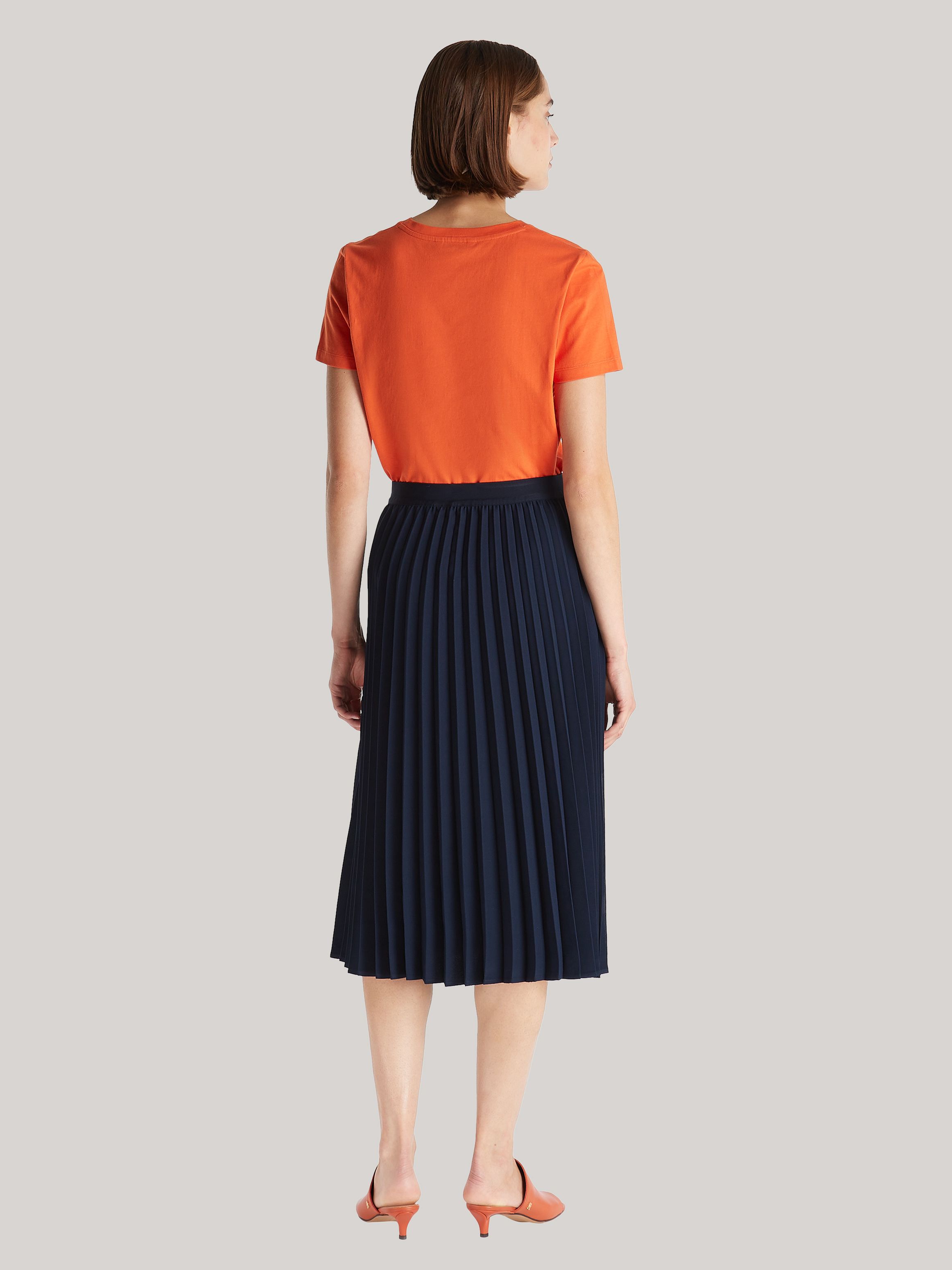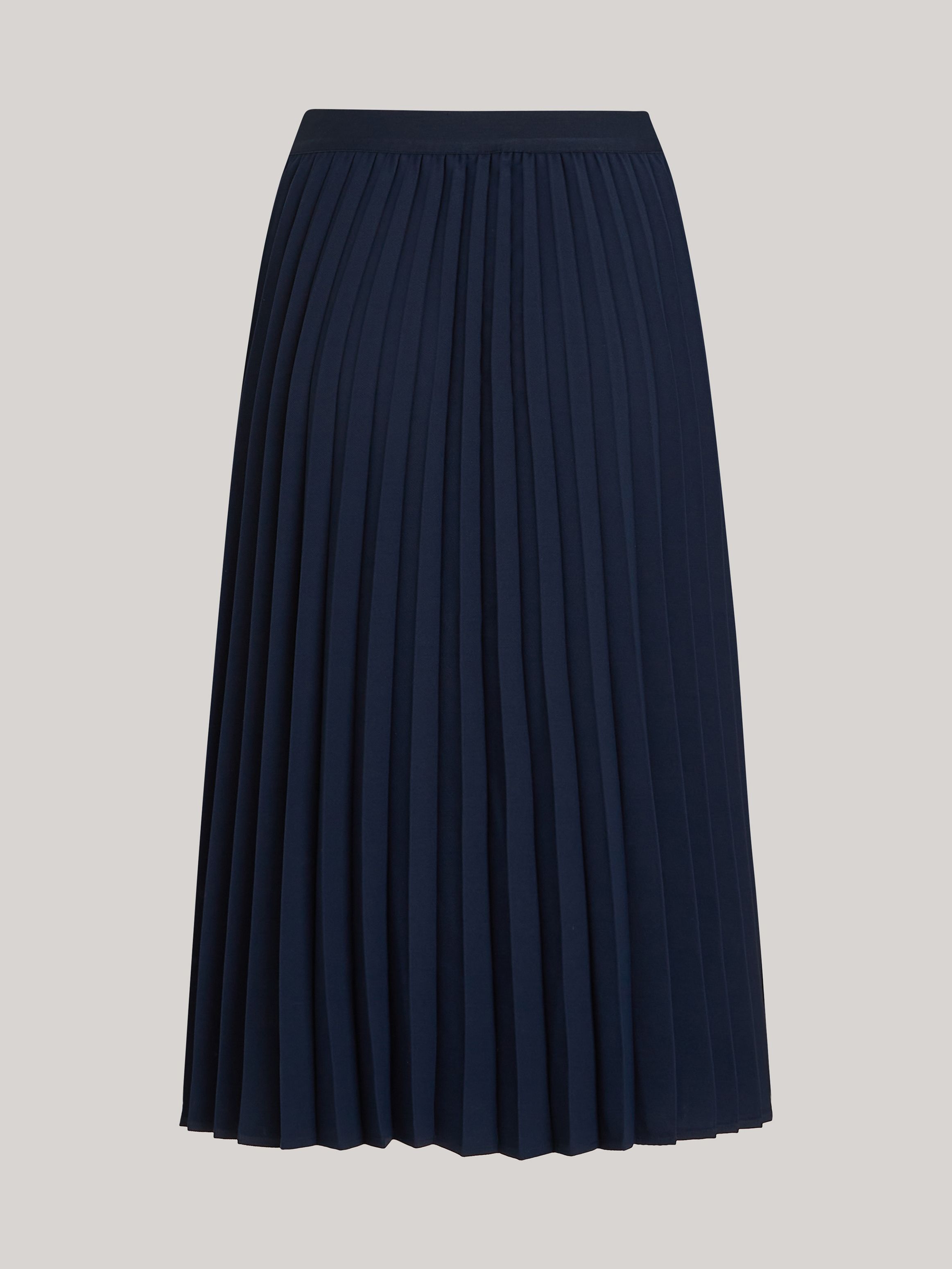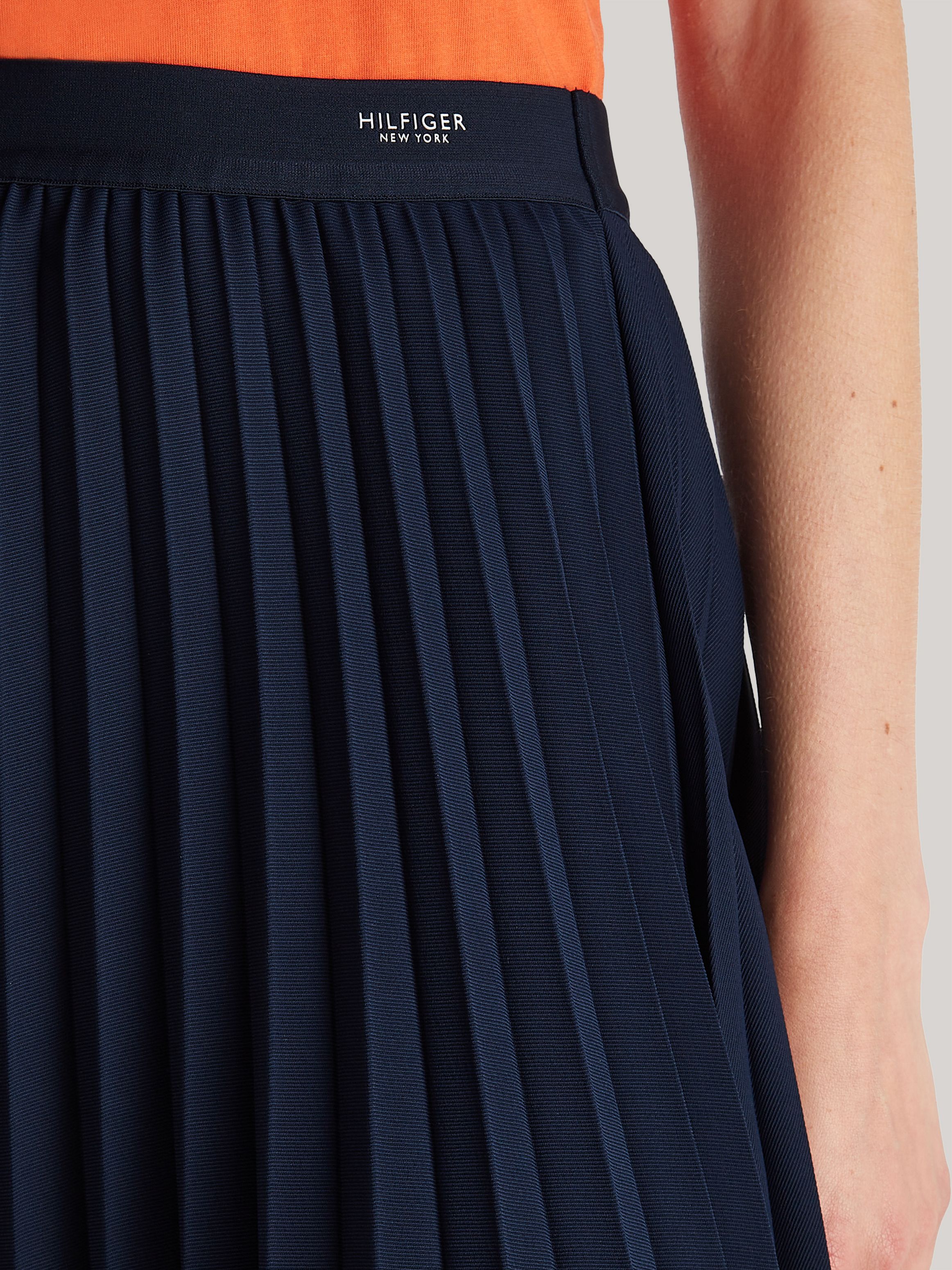 The pleated design and midi length of this skirt create a graceful look, complemented by a textured logo on the waistband.