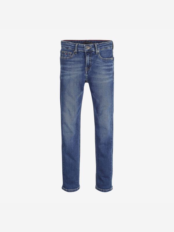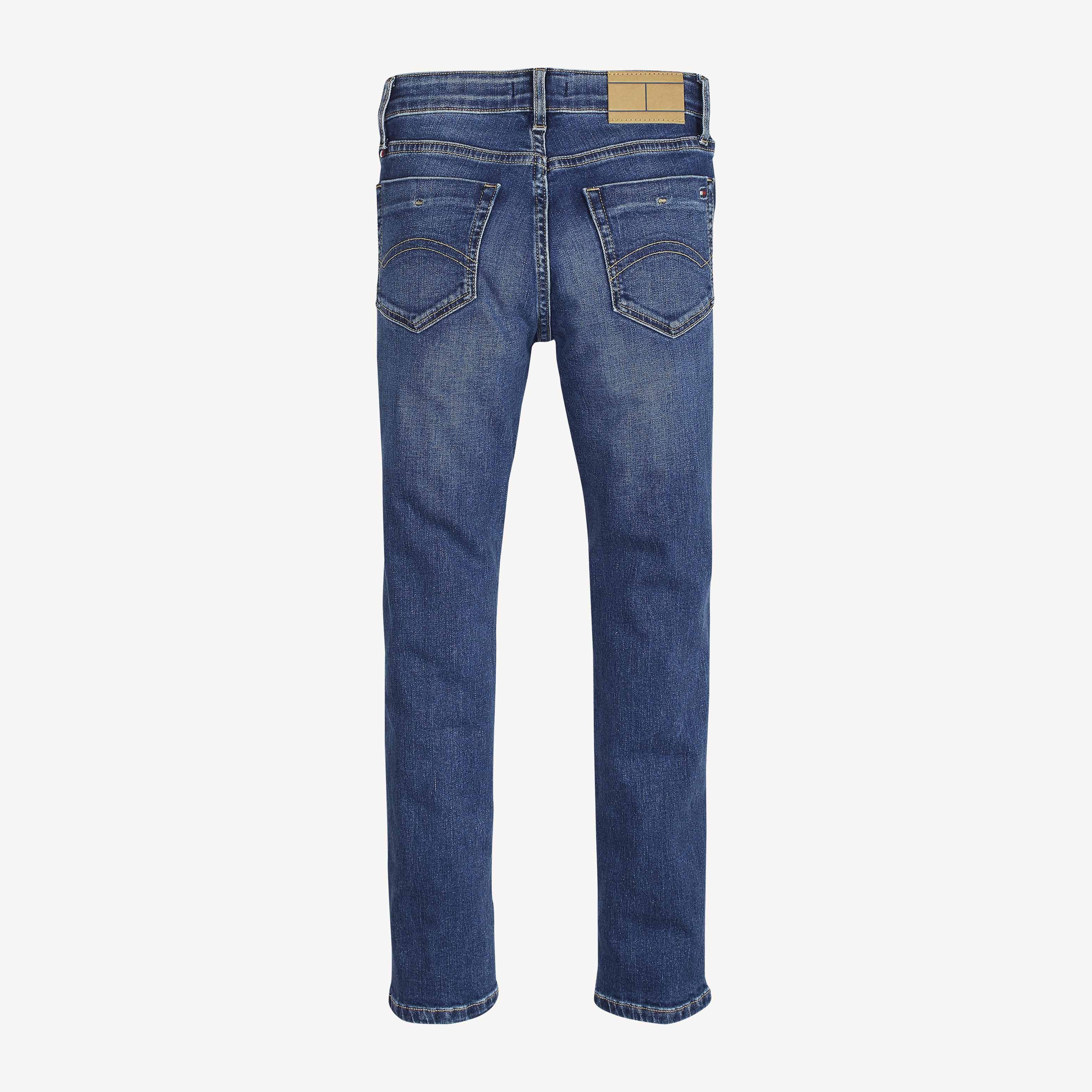 • Stretch cotton denim • Whiskers at top thighs • Fading at thighs • Zip with button closure • Five-pocket styling • Tommy Hilfiger branded hardware • Tommy Hilfiger flag metal tag inside waistband • Tommy Hilfiger logo patch on waistline • Tommy Hilfiger flag embroidery on coin and back pockets