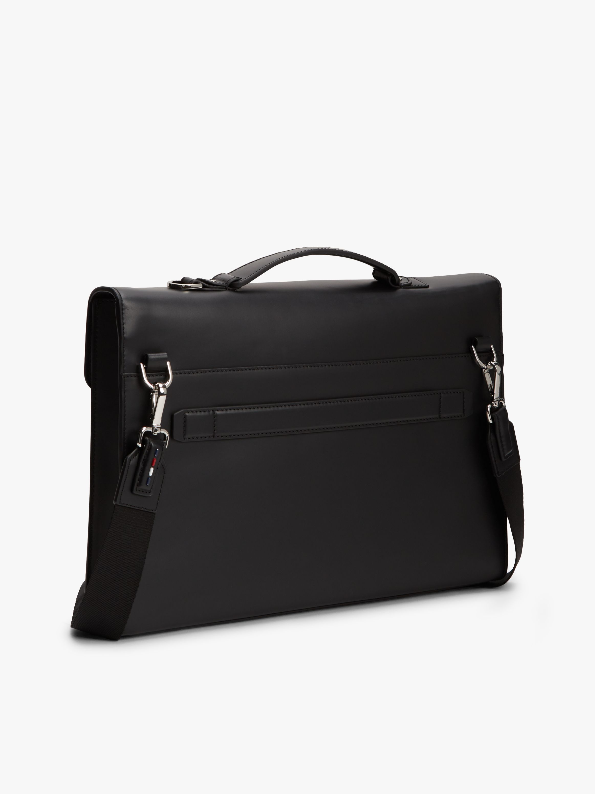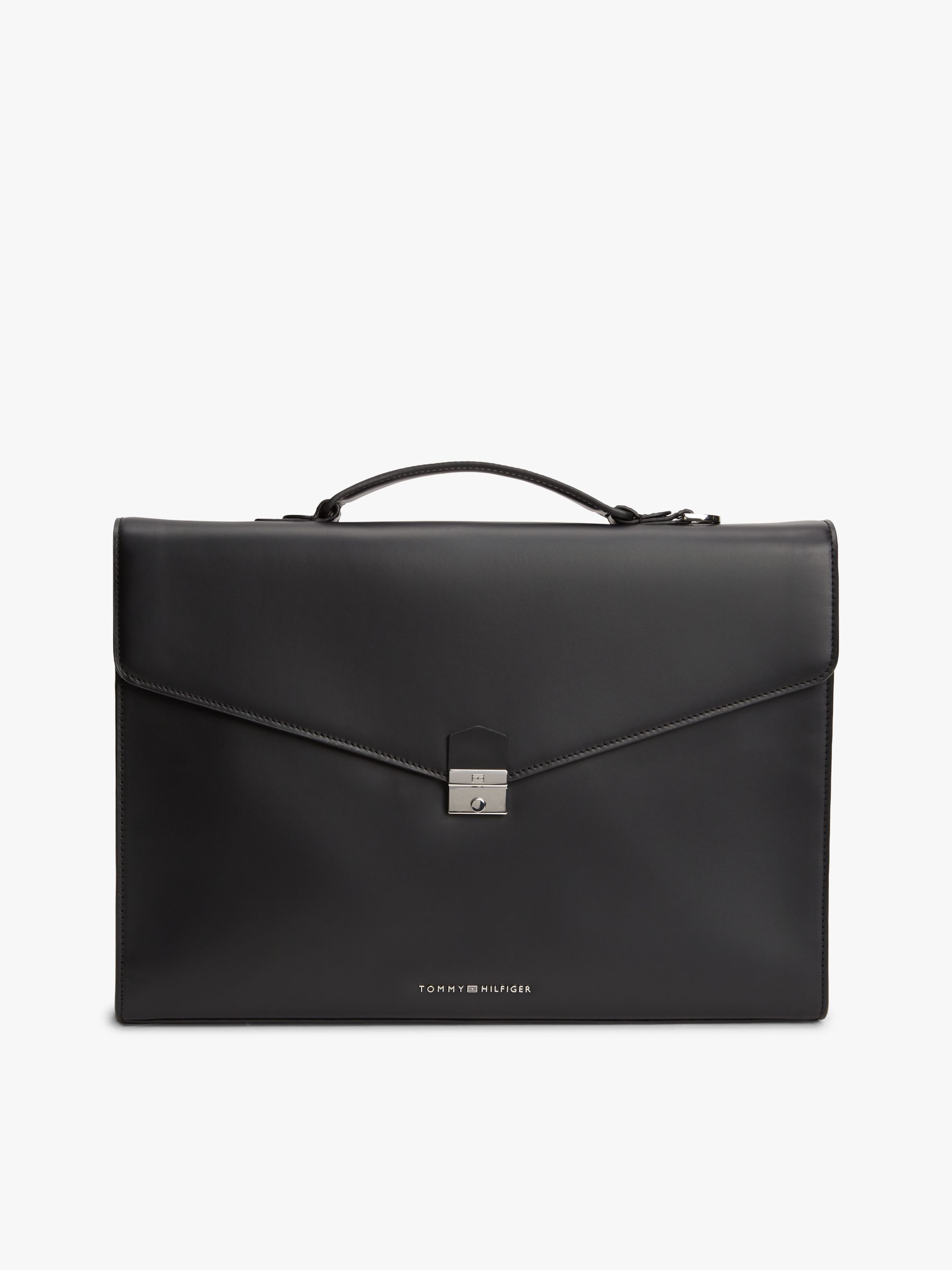• Leather • Smooth finish • Built-in laptop sleeve • Push lock closure • One top handle • One main compartment • Tommy Hilfiger metal logo on front • Tommy Hilfiger branding • Tommy Hilfiger flag debossed on closure