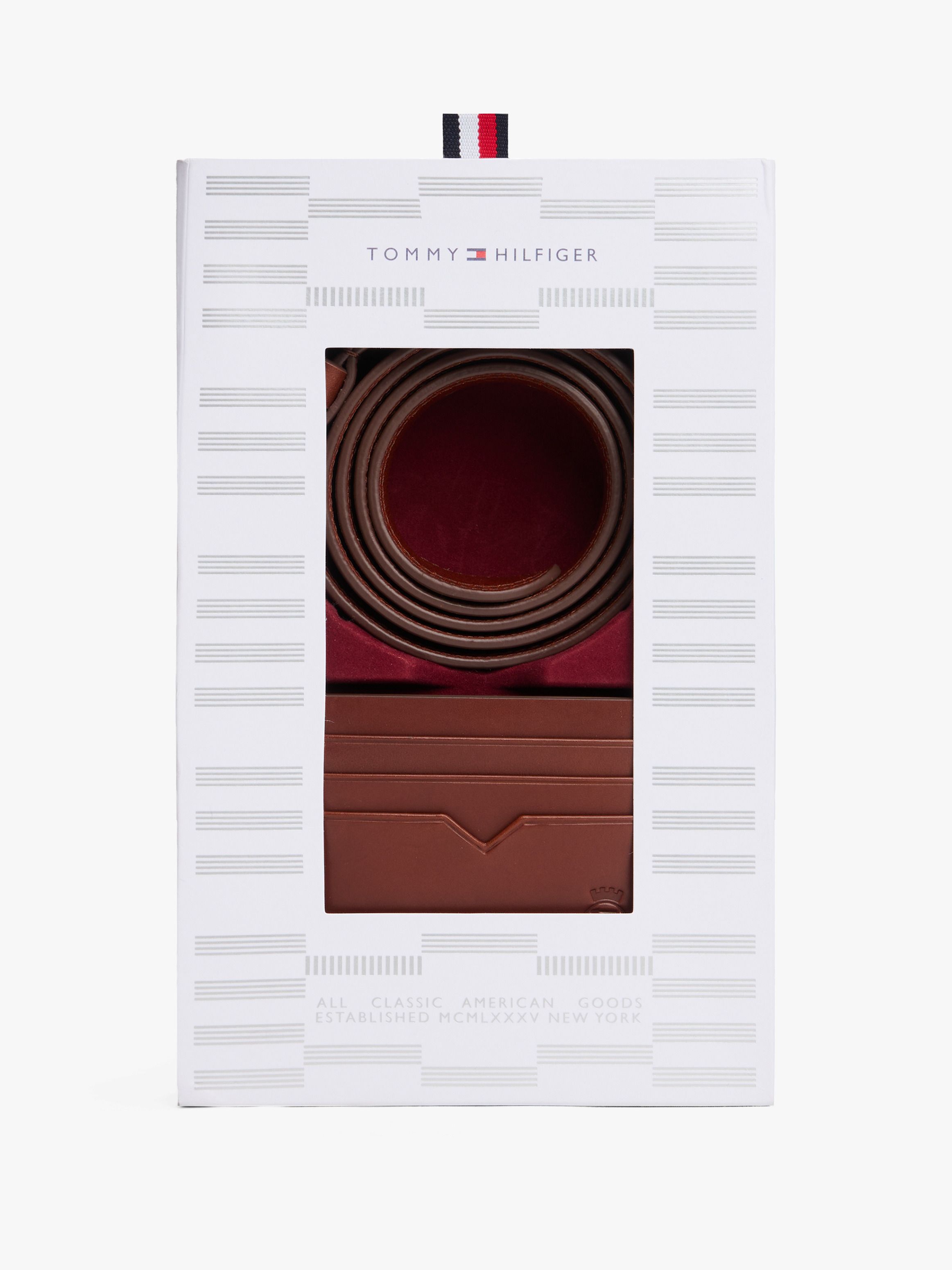 This gift box includes a belt and a coordinating card holder, both crafted from leather and stamped with the distinctive TH crest.