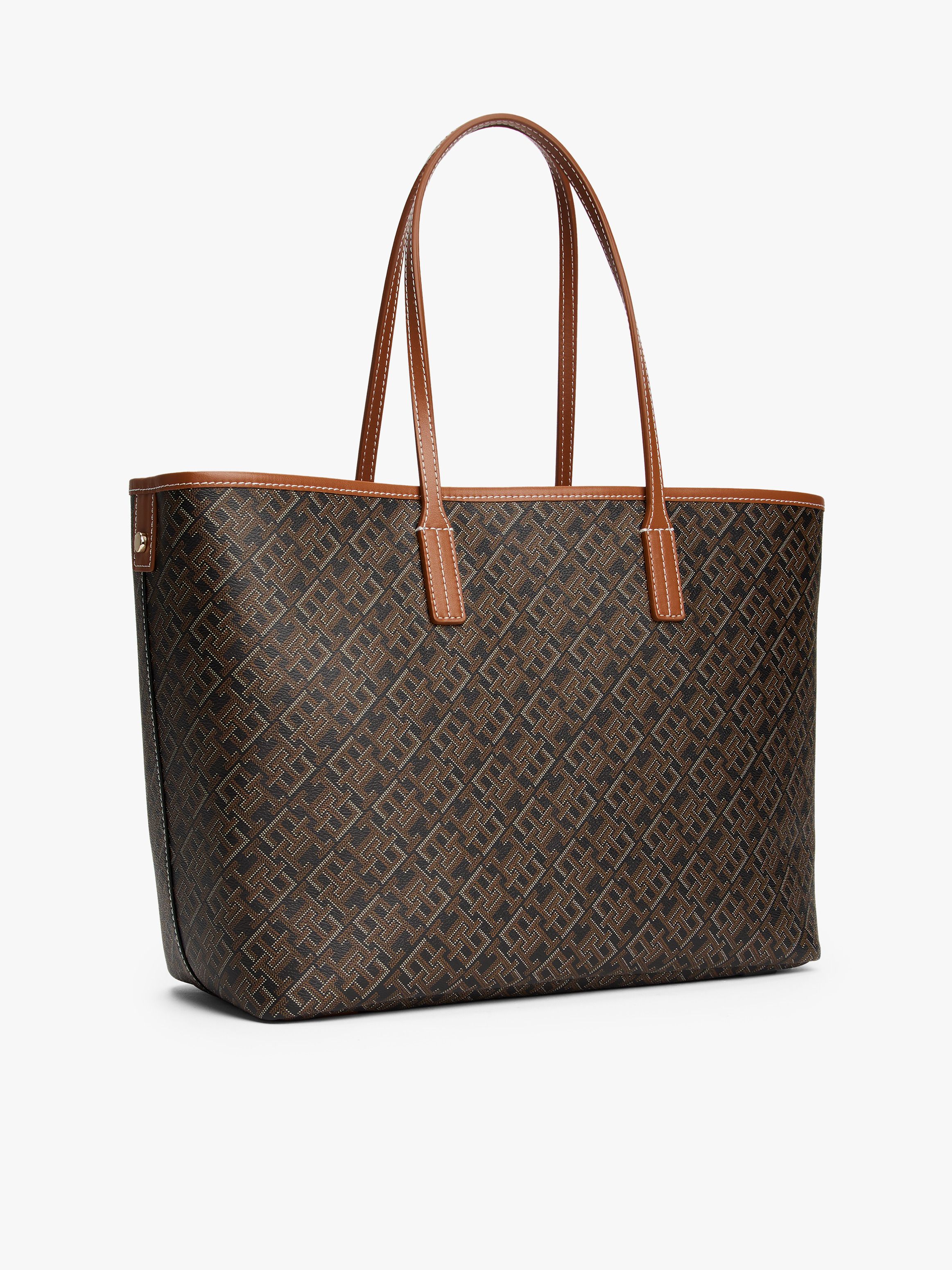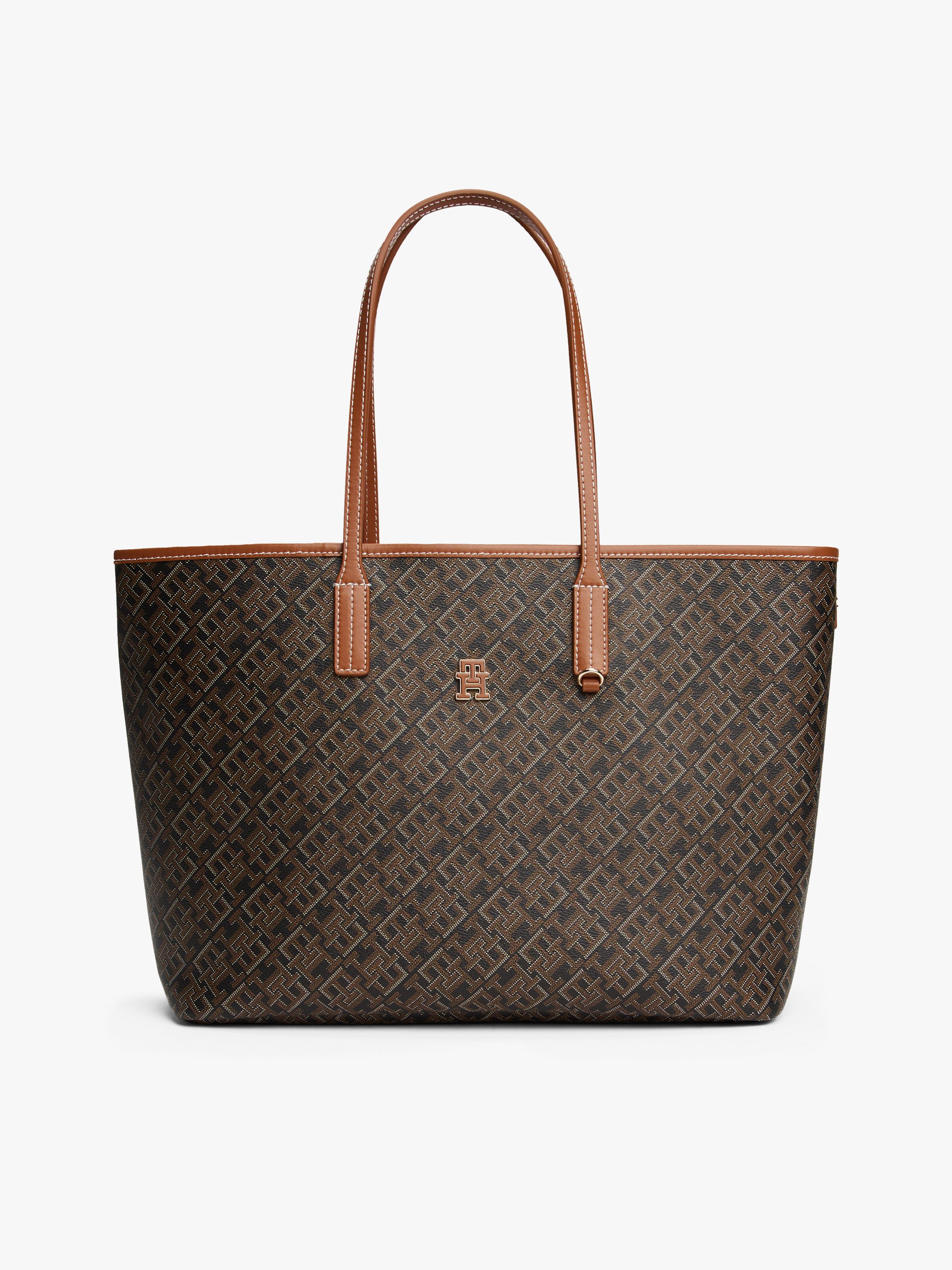 • Textured finish • All-over print • Two top handles • Two main compartments • One interior zipped pocket • D-ring keyring hook on front • TH monogram plaque on front • Tommy Hilfiger branding